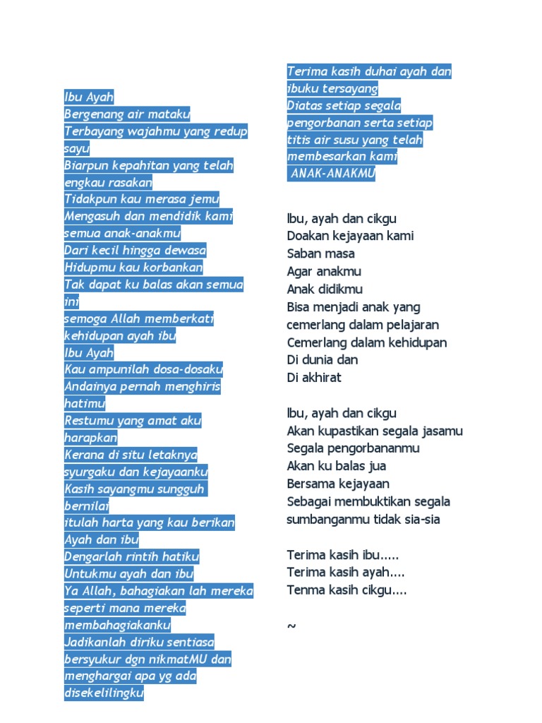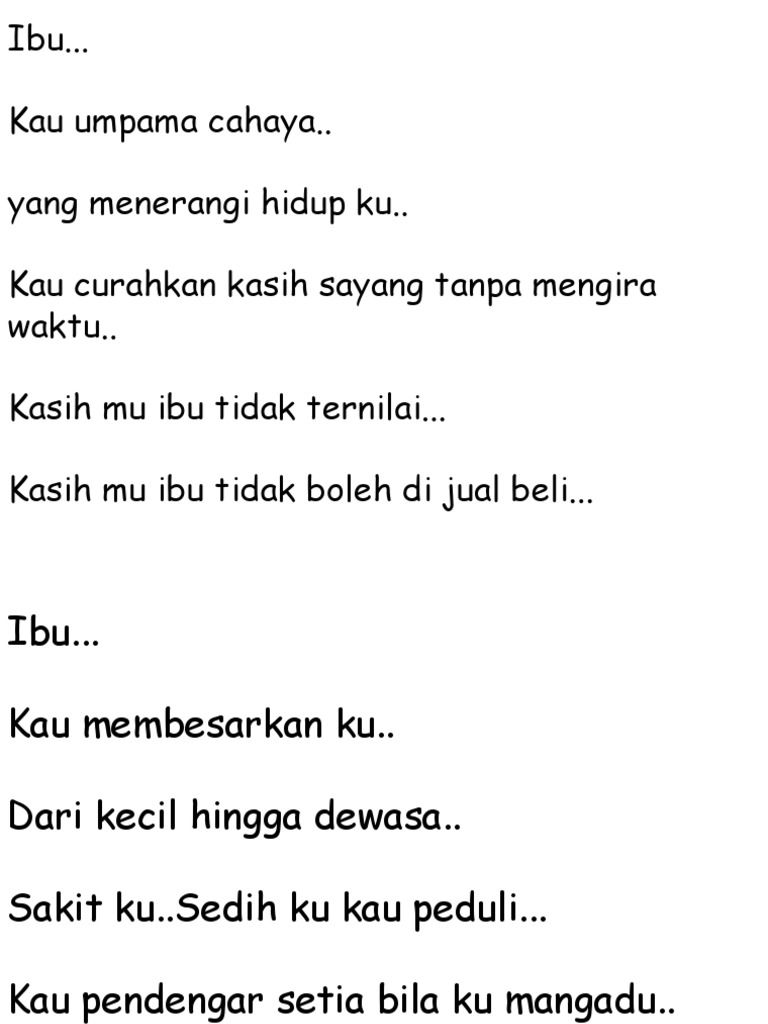 Sajak maksud kita ada ibu setiap manusia dilahirkan oleh ibunya. C) sajak pengorbanan ibu bapa. Sajak pesan ibu beribu ribu. Usia 5 tahun * peristiwa pembelahan dada rasulullah saw yang dilakukan oleh dua malaikat untuk mengeluarkan. Ibu ayah bergenang air mataku terbayang wajahmu yang redup sayu kudusnya kasih yang engkau hamparkan bagaikan laut yang tak bertepian biarpun kepahitan yang telah engkau rasakan tidakpun kau merasa jemu mengasuh dan mendidik kami semua.